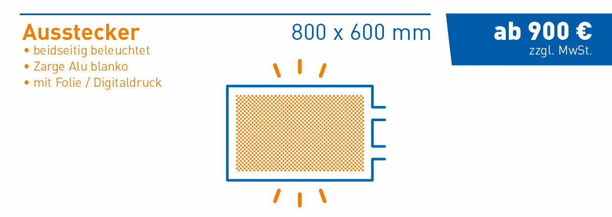 Ausstecker werden quer zur Laufrichtung der Kunden montiert und wirken daher besonders aufmerksamkeitsstark. Ob rund, eckig, mit aufgesetztem 3D Logo, mit oder ohne Beleuchtung – wir bauen Deinen Werbe-Ausstecker genau für Deinen Bedarf.